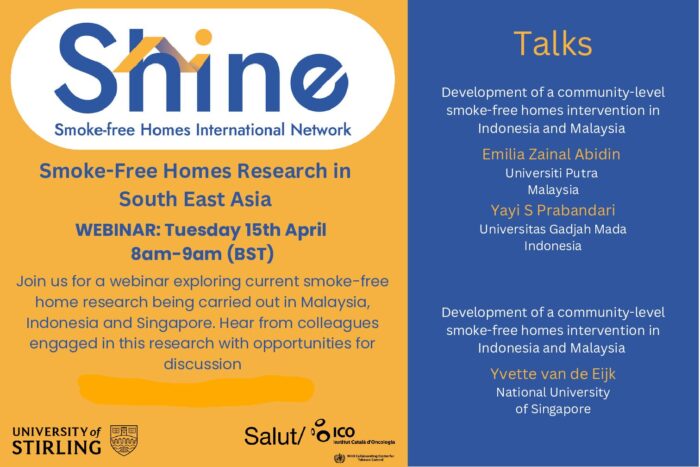 SHINE Webinar 5 was held on 15th April 2025 focusing on current smoke-free homes research in South East Asia (Malaysia, Indonesia and Singapore). Watch the webinar here.